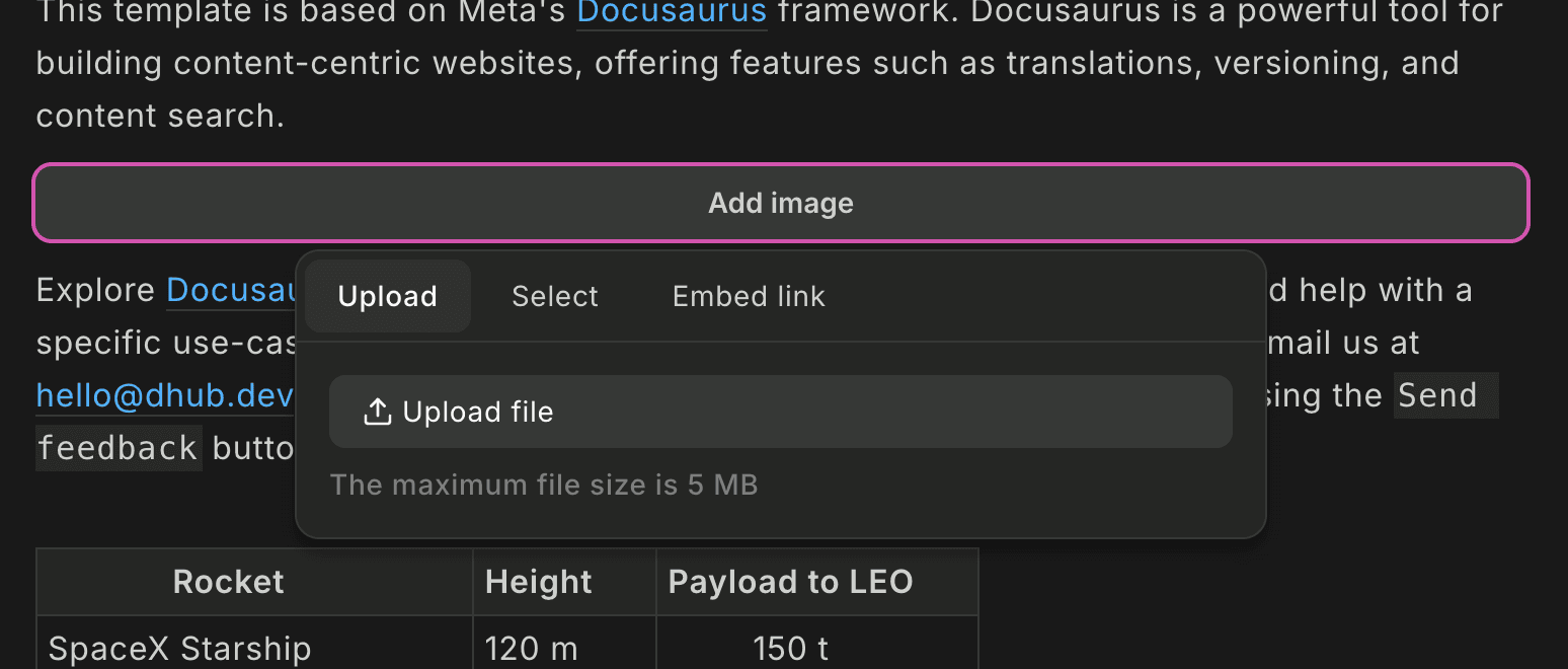 For all the common components in Docusaurus Markdown like tables, code blocks, and details, Dhub converts them into WYSIWYG editable widgets in the editor.