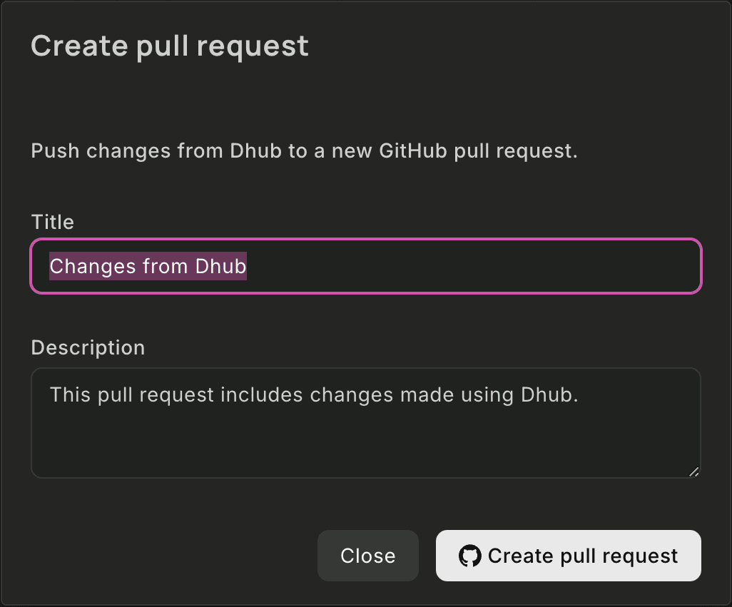 Dhub creates a new branch and pull request only if the previous pull request created by Dhub is already closed or merged. Otherwise, it updates the existing pull request. This enables a workflow where you can push changes to the same branch multiple times during your editing session, and then review and merge everything into your main branch in one go on GitHub.
