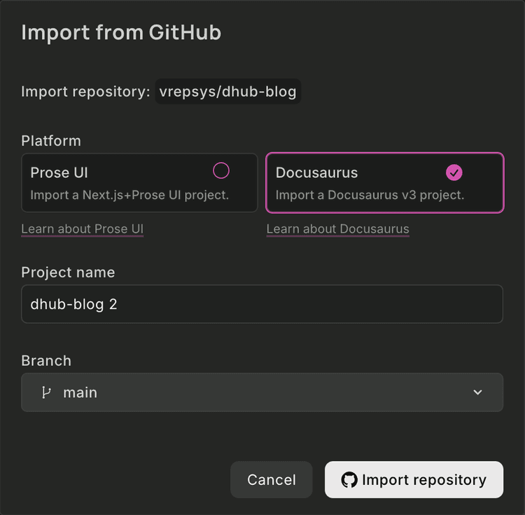 After clicking import, select the Docusaurus platform and pick a name for your project in the import modal. You may also change the branch you want to import. You can safely use your main or development branch here. Dhub doesn't push changes directly to this branch—instead, it creates pull requests that you can review on GitHub before merging them.