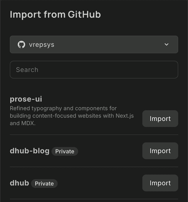 After you connect Dhub to a GitHub account (personal or organization), you'll be able to import any of your projects from your account to Dhub very easily.