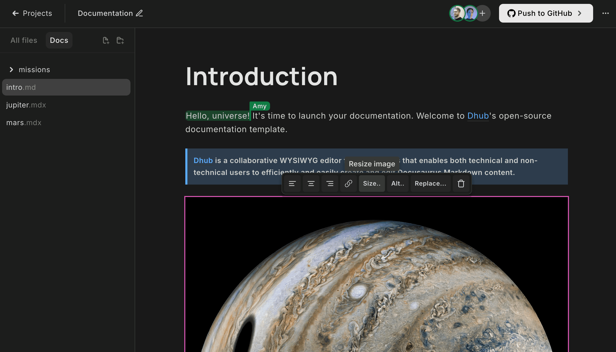 Dhub was born from a real need in the Docusaurus community—making content creation accessible to everyone regardless of technical background. It makes content editing faster and more intuitive, without losing the power of Git-based version control.