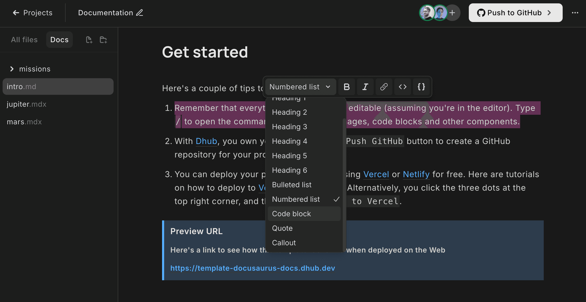Dhub is an online tool that doesn't require installation or complicated setup. After signing up, you can simply import your Docusaurus project from GitHub (or create a new one from a template) and start making changes immediately.