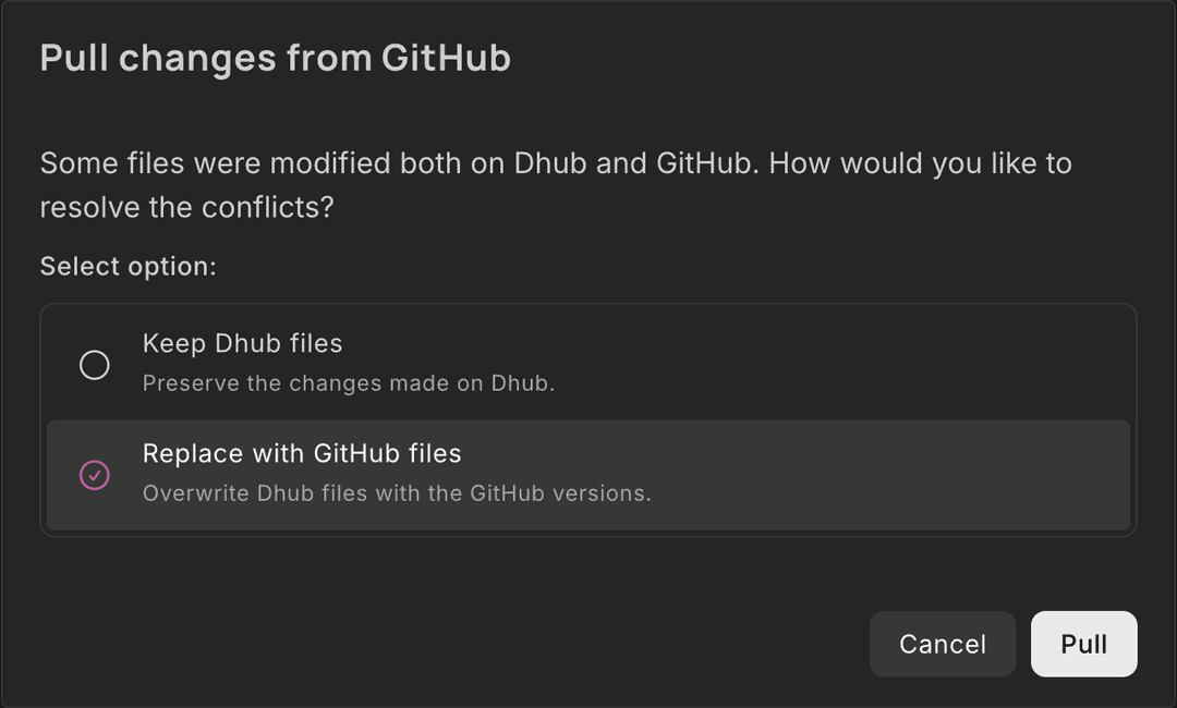 What happens when you try to pull a file that's changed both on GitHub and in Dhub? No problem at all. You'll be presented with a screen where you can choose whether to overwrite the conflicting file with the version from GitHub, or keep it as it is in Dhub.